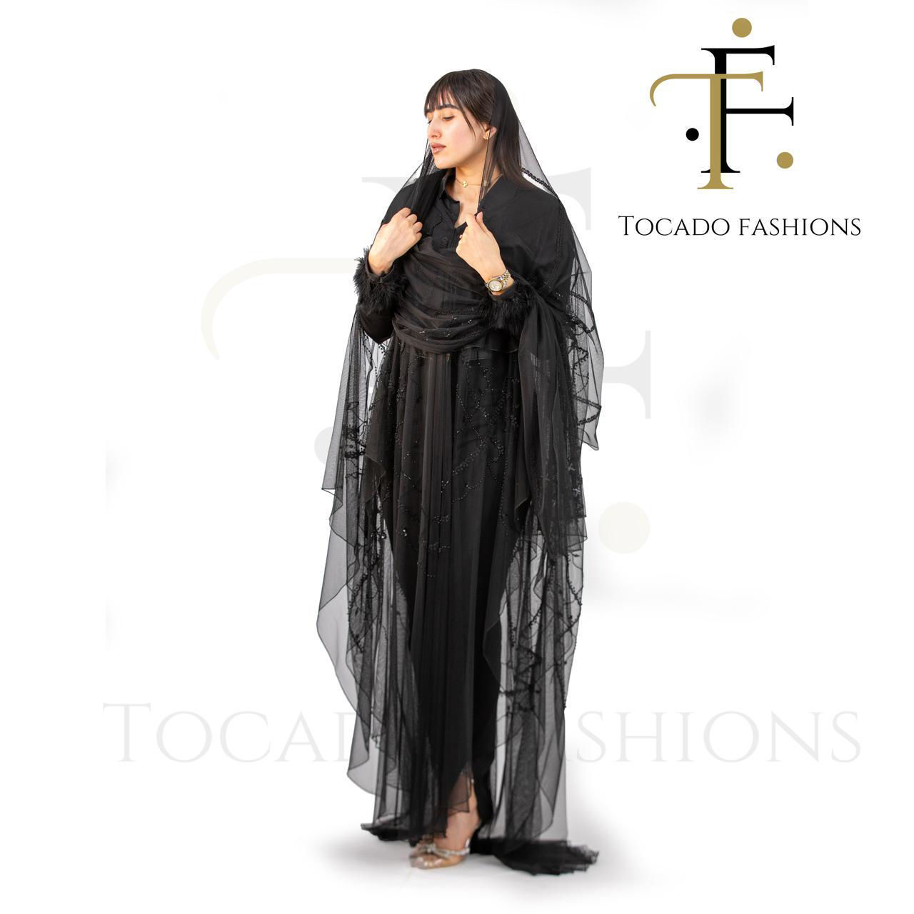 عباية سوداء فاخرة مع طبقة شفافة مطرزة ولمسة أنثوية أنيقة.
