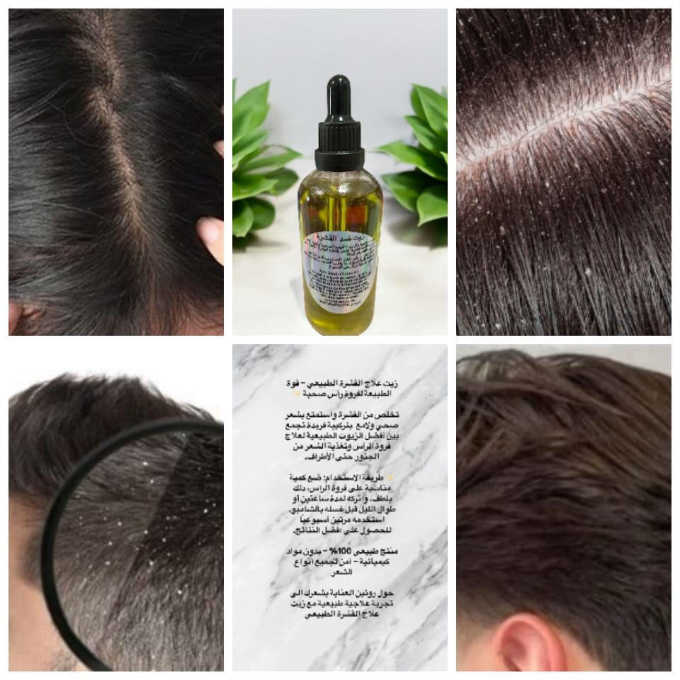Anti-dandruff oil A natural compound of several therapeutic oils such as neem oil, jojoba, coconut, and others that work to combat dandruff and to treat dry and inflamed skin on the scalp that causes dandruff and itching, and has anti-inflammatory properties. Drops are taken on the affected area, massaged with the palm of the hand, combed a little, then left for about half an hour, then washed and repeated the process twice a week